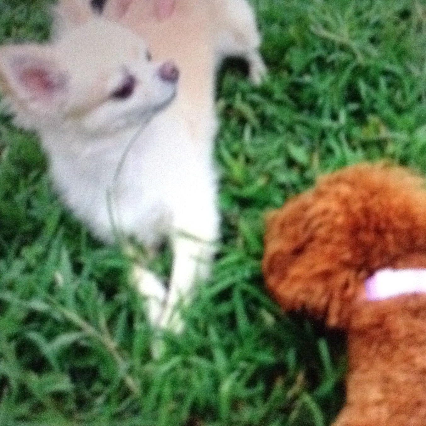 小型犬ににらまれビビッドなドリ