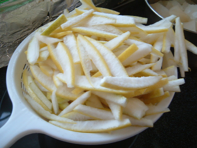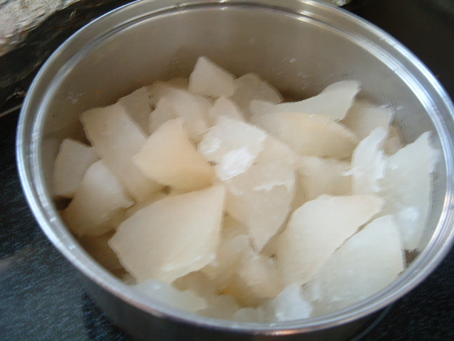熱湯をかけ水洗いを何度も繰り返して白い皮が透き通ってきたら砂糖を入れて煮る